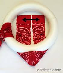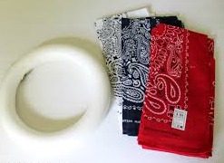 Materials: 9 Bandanas - 3 red, 3 white, 3 blue, green styrofoam wreath (I used 9 inch), scissors, and ruler.